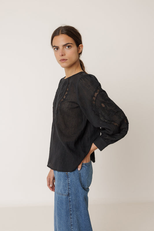 Blouse à col rond avec fermeture en forme de larme et bouton à l'arrière. Elle présente des broderies florales travaillées sur un fond en maille, une pièce spéciale qui apportera une touche sophistiquée à tes looks cet hiver.