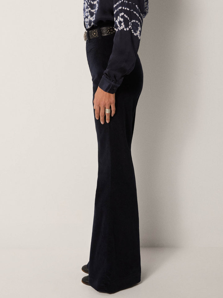 Le pantalon Jerry Marine AW25 est confectionné en velours côtelé de coton doux, à taille haute et coupe évasée, alliant élégance et confort. Sa coupe structurée garantit une silhouette impeccable, idéale pour toutes les occasions. La teinte bleu marine intense, aux reflets changeants, évoque la profondeur de l’indigo et la sérénité du ciel nocturne.